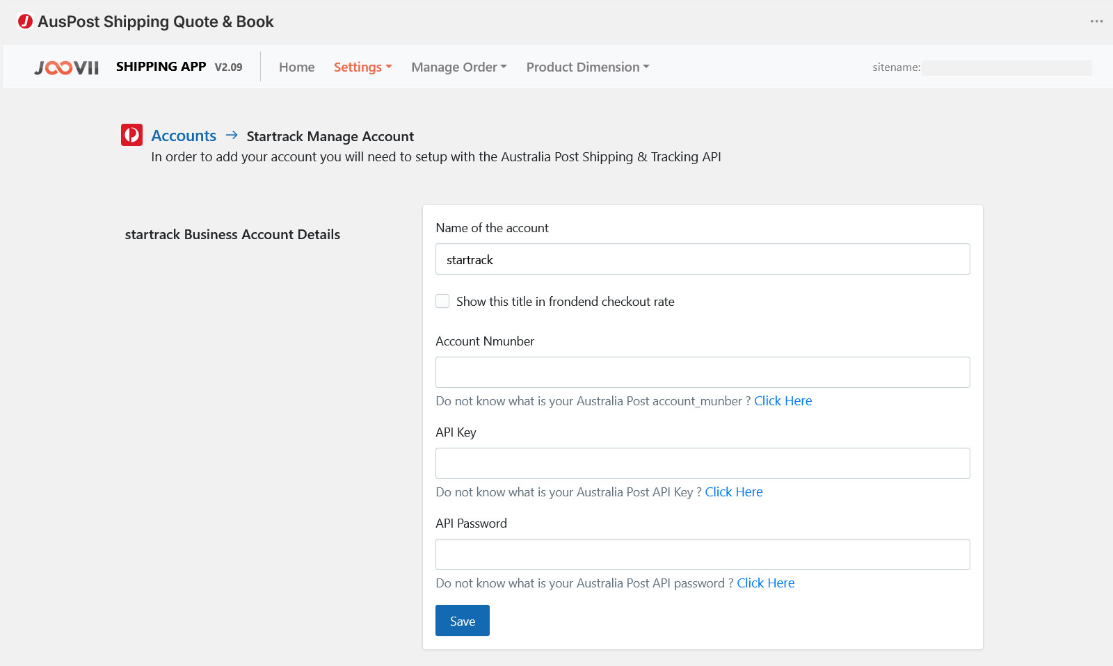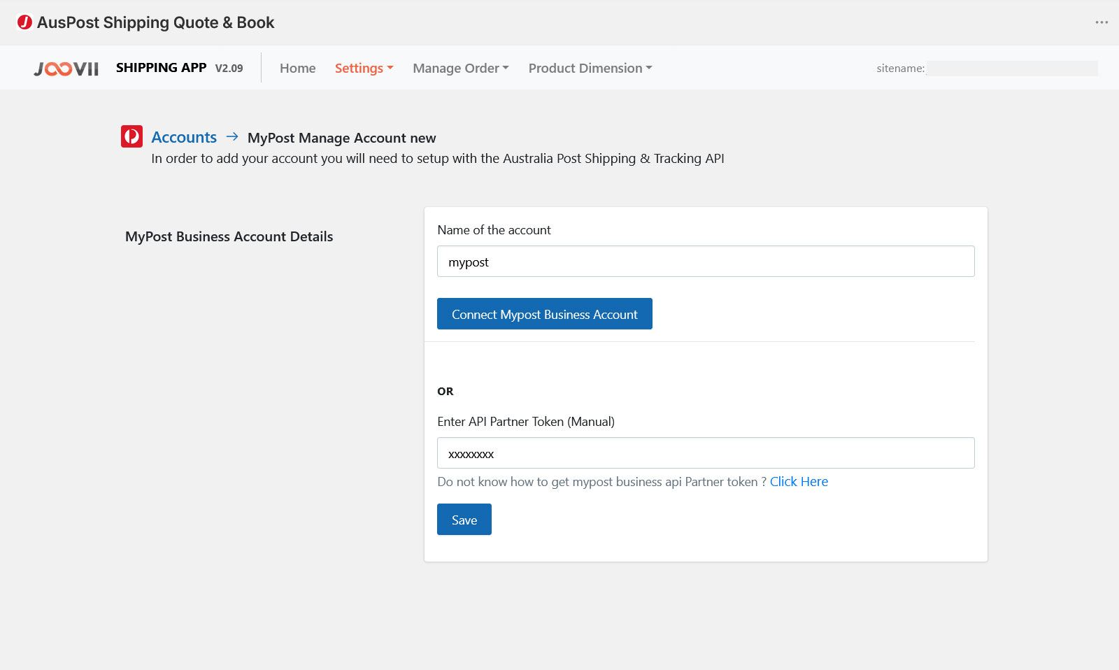 First one box is for account management. Here you can add a Mypost, eParcel or Startruck account to get shipping quotes and book shipments when fulfilling orders.