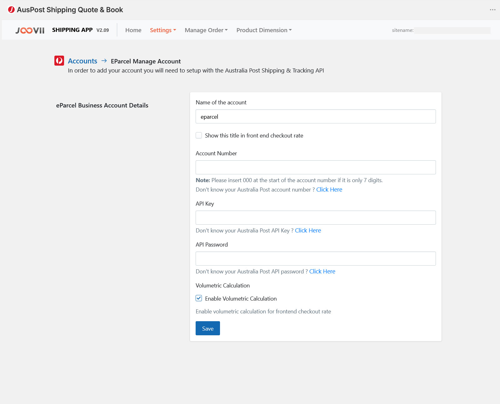 6. You can add other Carriers Accounts like Startrack & EParcel. Then add General Settings for Startrack & EParcel like Name of the account, Account Number, API Key, API Password, Volumetric Calculation & status.