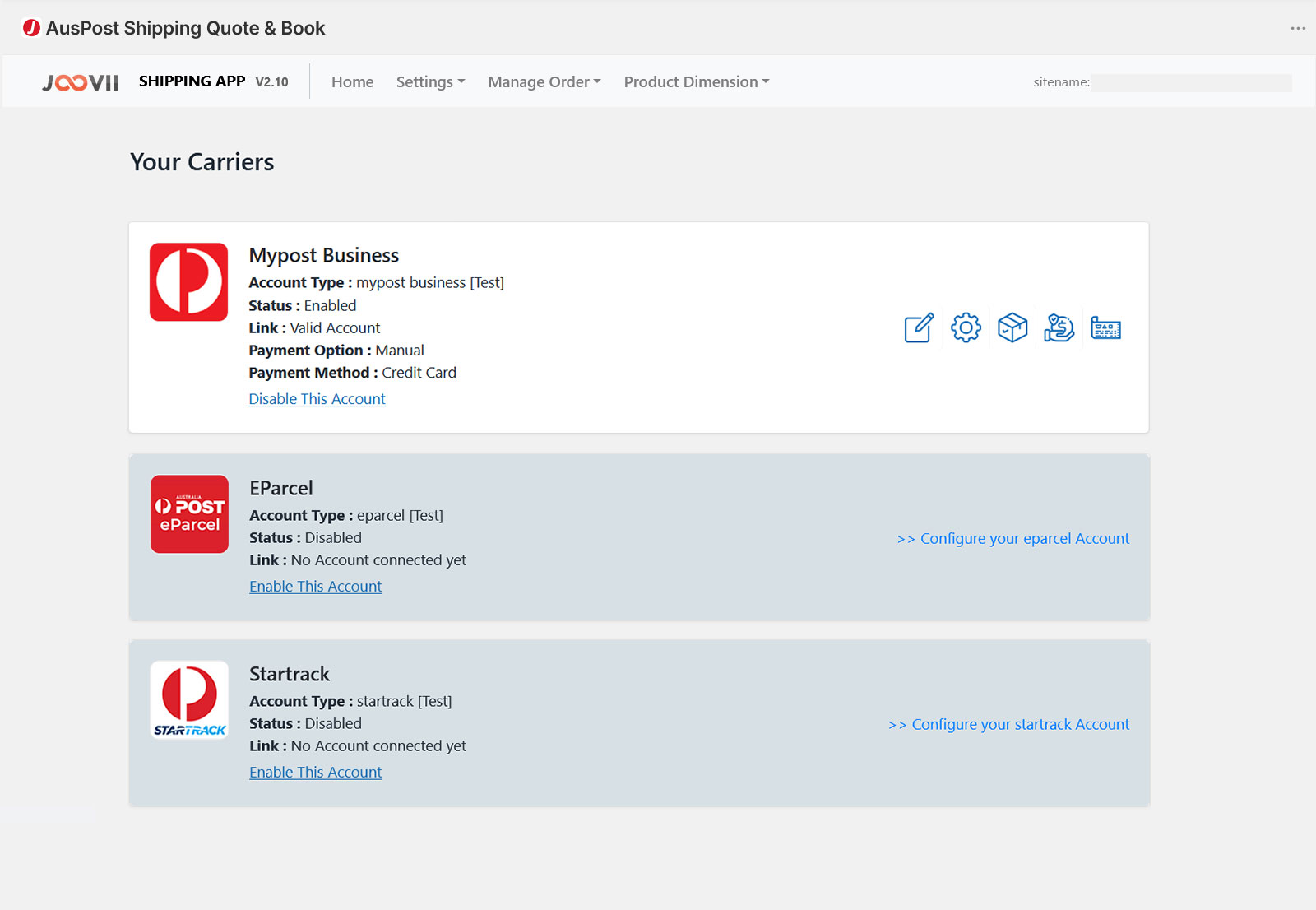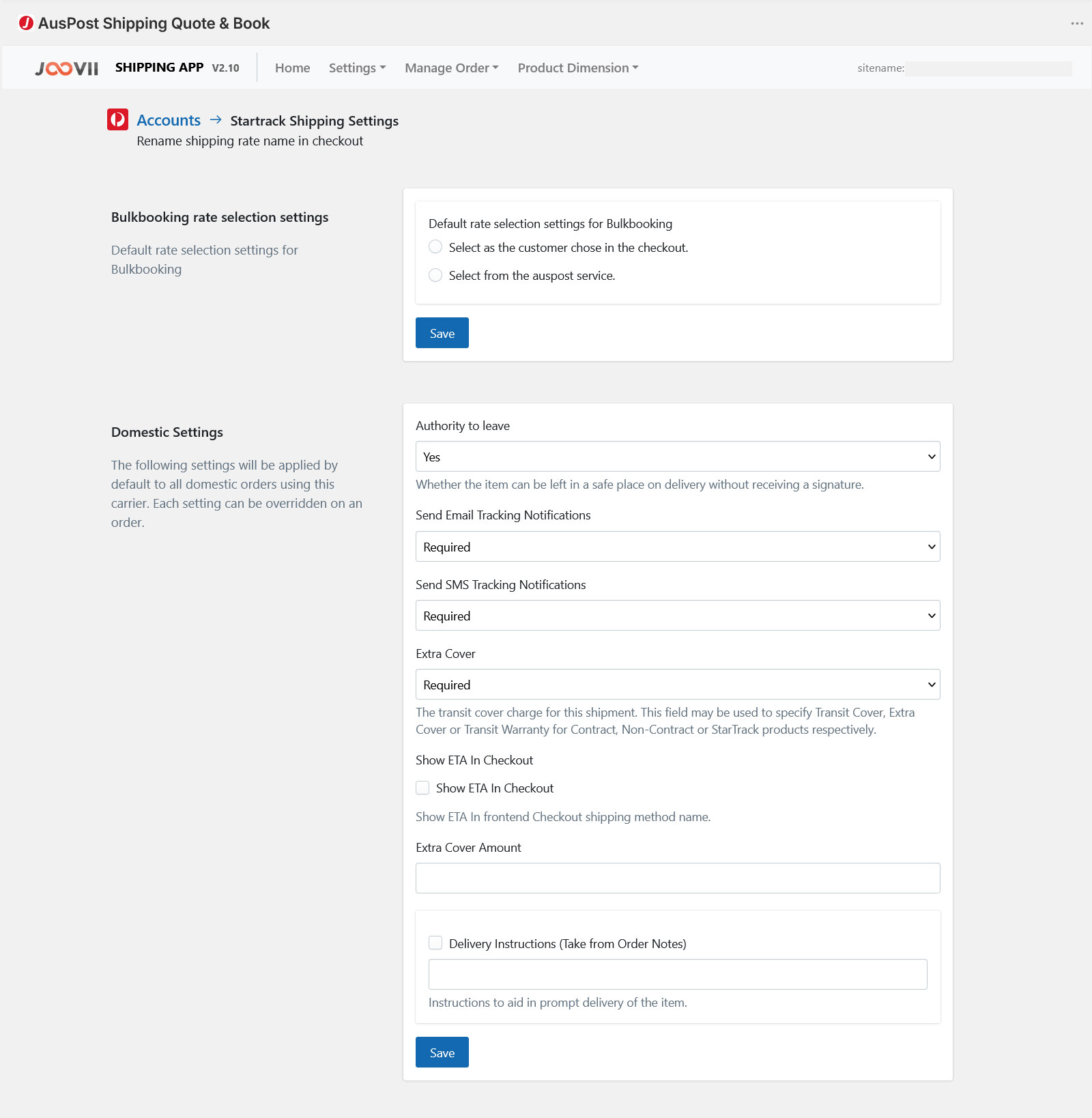 After configure startrack Account From the settings page you can add/edit startrack account details, update other settings like Bulkbooking rate selection settings, Domestic Settings & International Settings, add/edit package details, manage services & Generate label samples inside your eParcel Business portal.