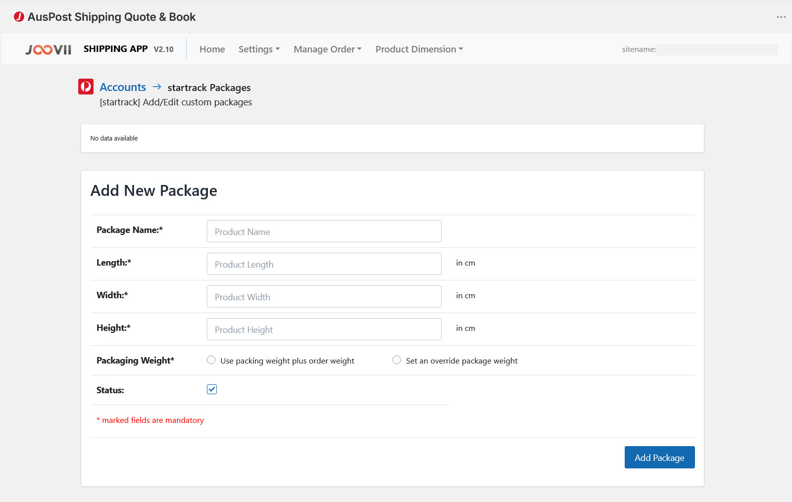 Packages : You can add / update package details like name, length, height, width, weight & status. also can delete Custom-Packages.