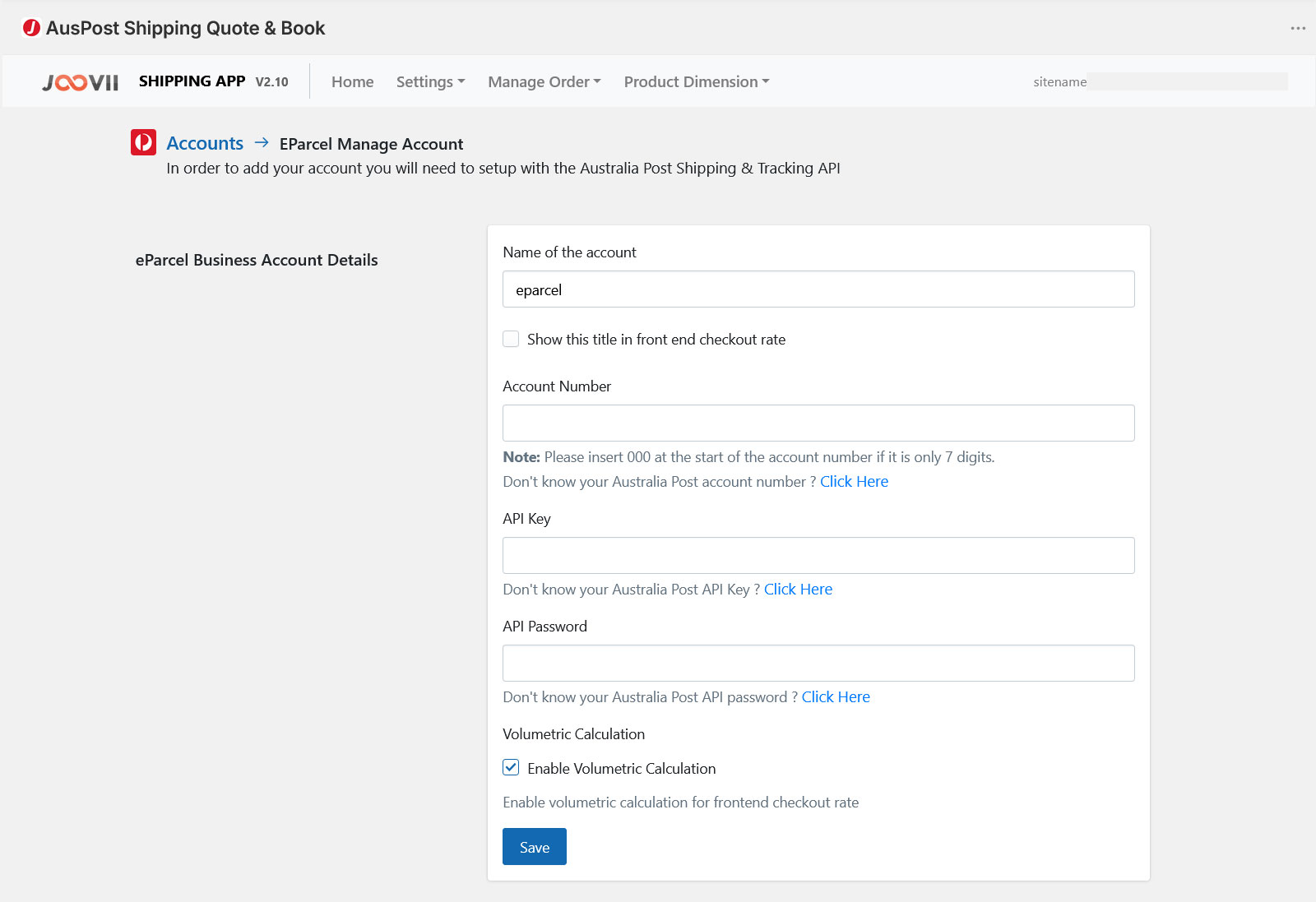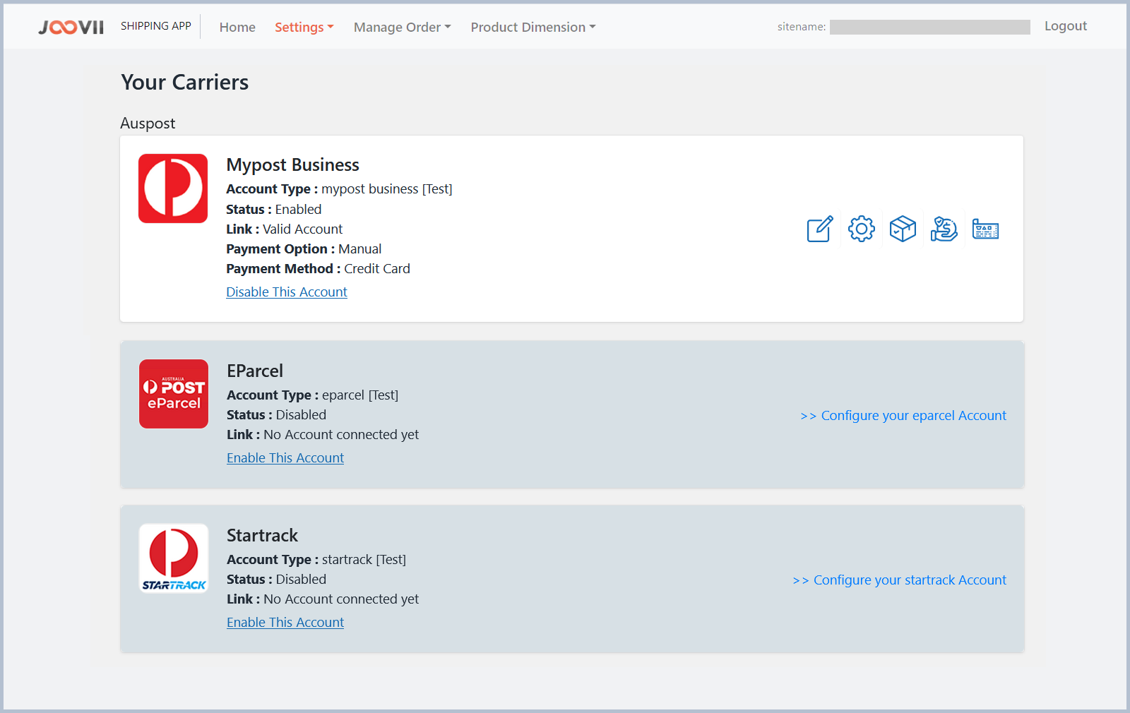 After configure eParcel Account From the settings page you can add/edit eparcel account details, update other settings like Bulkbooking rate selection settings, Domestic Settings & International Settings, add/edit package details, manage services & Generate label samples inside your eParcel Business portal.