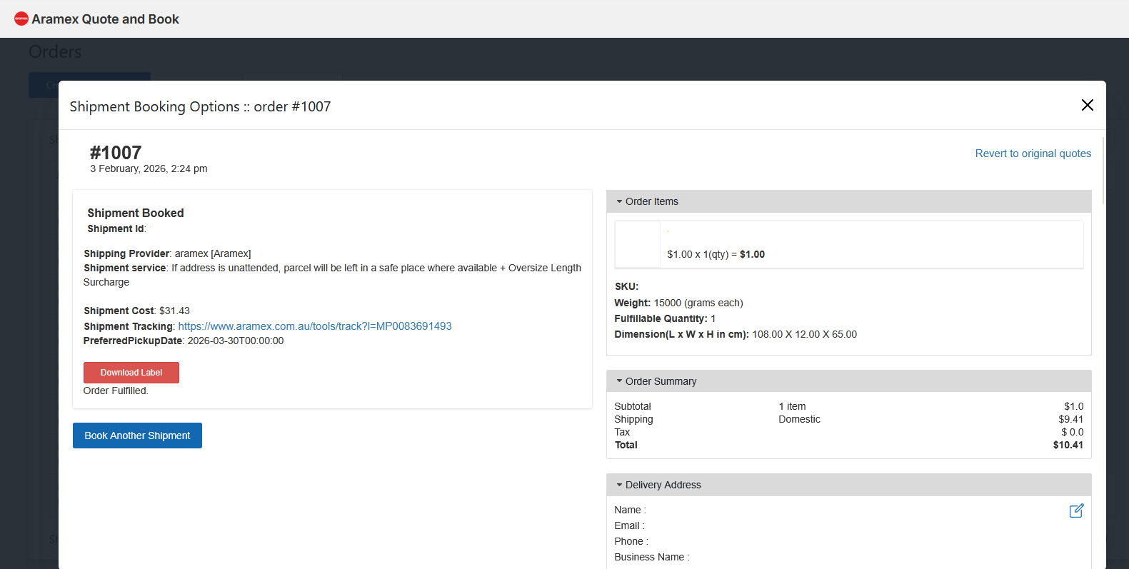 The app allows merchants to easily book shipments using their Aramex account while within the WooCommerce admin. Details from the customer order for size and weights are used both for quoting in the checkout and as prefilled info for placing a booking. Bookings are fully integrated into the order fulfillment process, updating the customer orders with tracking details. Merchants can choose from multiple services. Bulk booking is available for multiple orders to be booked at once.