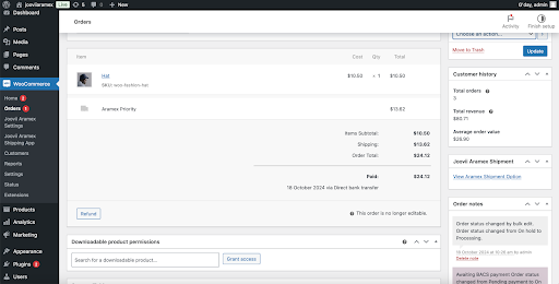 A merchant can jump straight in to booking a shipment from the WooCommerce Order Details page by opening the order, on the right side menu is the section for “Joovii Aramex Shipment Option”. This link will take you to the booking screen for the order.