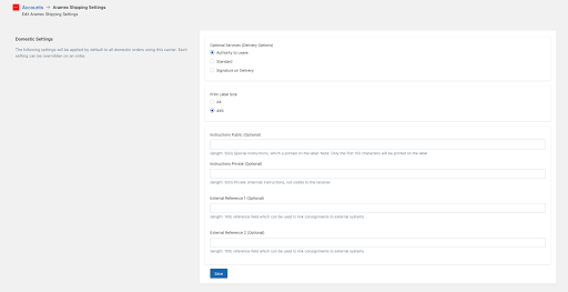 Print Label size can also be set with A4 and 4x6 (A6) options available. This determines the size of the labels available for download once a shipment is booked.