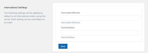 Here a generic description of the goods in the shipment can be set which is used across all international orders customs declarations, along with a declared value.