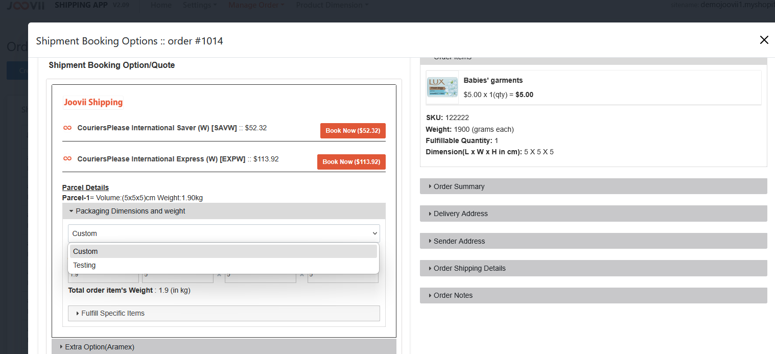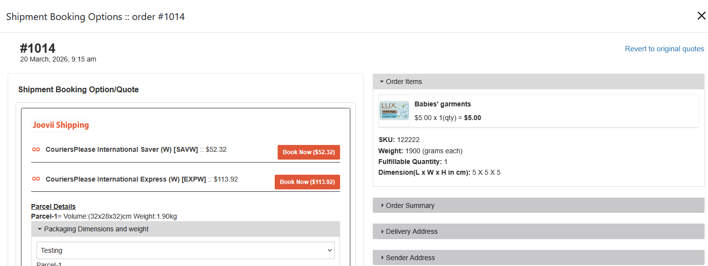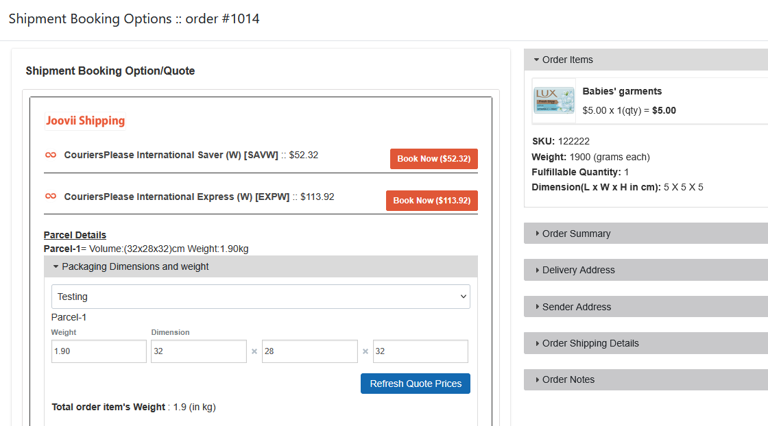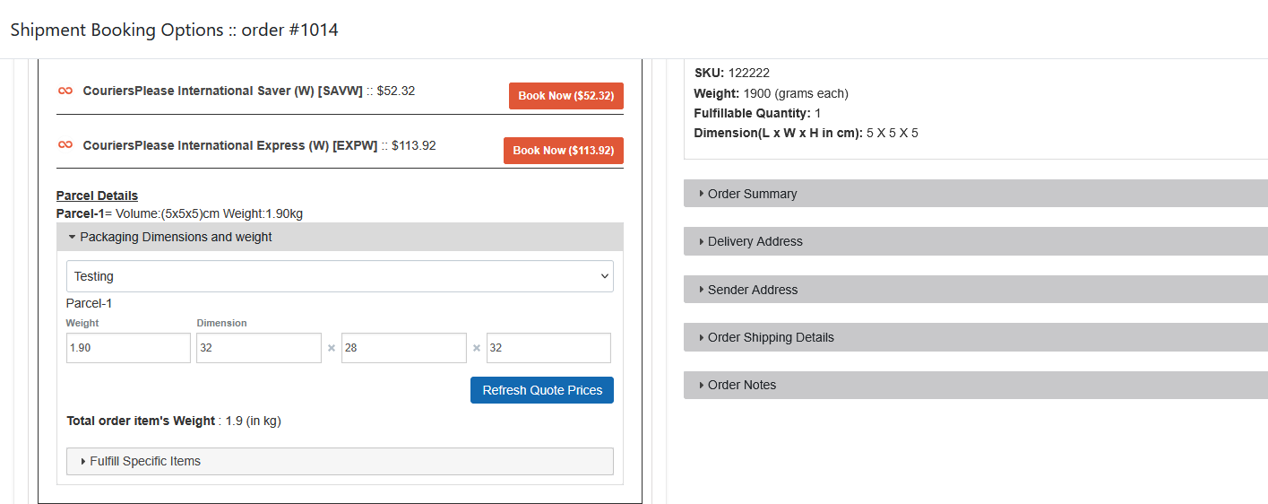 You can now see that the quote has refreshed in Parcel 1 from 5x5x5 1.90kg to 32x28x32 1.90kg