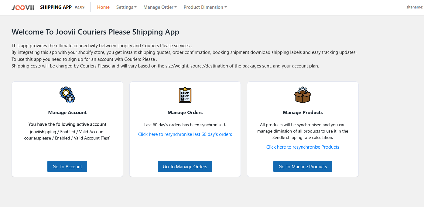 The first box is for account management. Here you can enable and configure Joovii shipping.