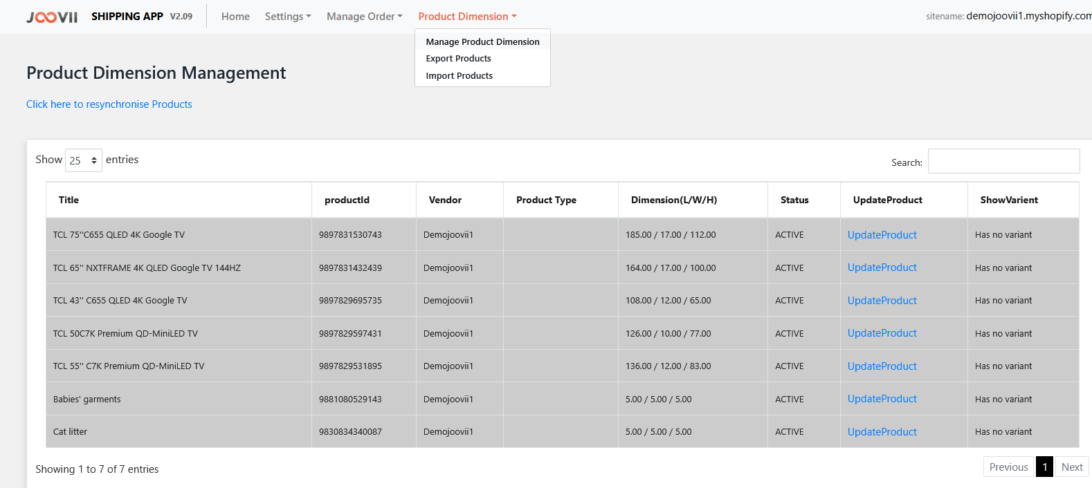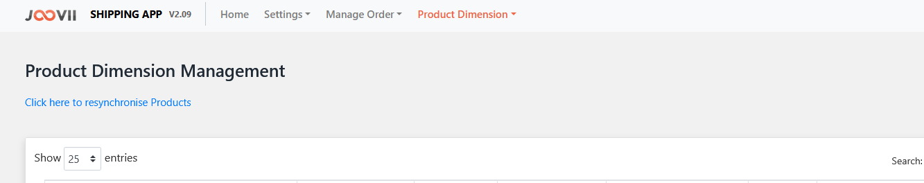 As Shopify has no official method for managing dimensions (packaging really only works for a single item) Joovii apps have a location where dimensions can be saved for every sku . All the Shopify products will be automatically synchronized to our system after installation of the app. Also merchants can resync products at any time.