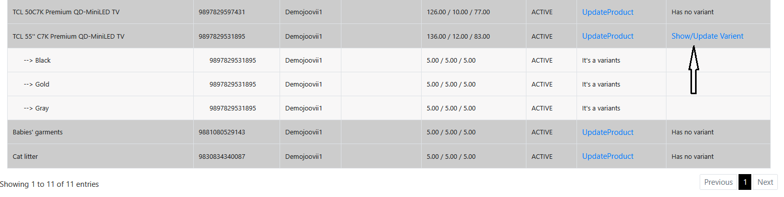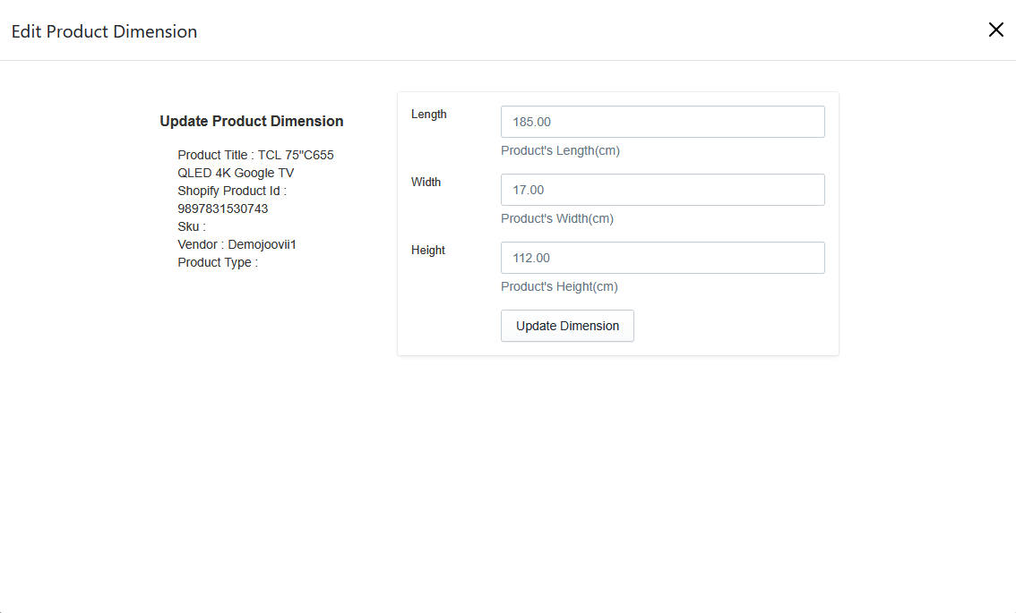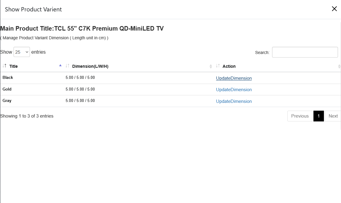 You can see all products with product name, vendor, product type and dimension with a search option in the product list page. You can also see a link to update dimension or show product variants which will open a popup with all options.