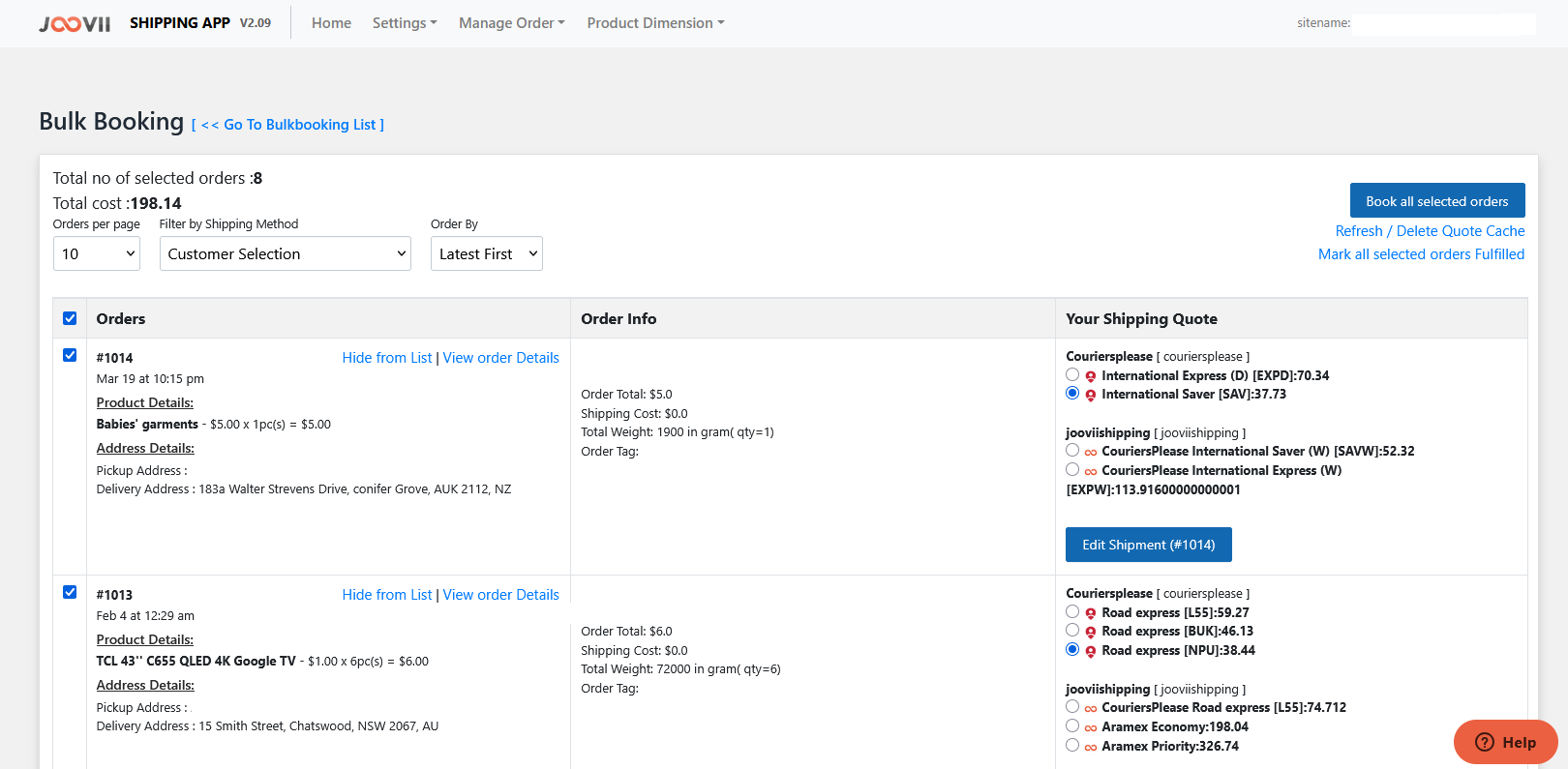 A key feature of the bulk booking process is the ability to preview all shipment quotes and their proposed shipping methods before making the bulk booking. This gives the user the ability to change the pre-selected booking option or selected shipping method of any order in that list prior to going ahead. There is also the option to deselect orders before finally using the book button to book all selected orders.