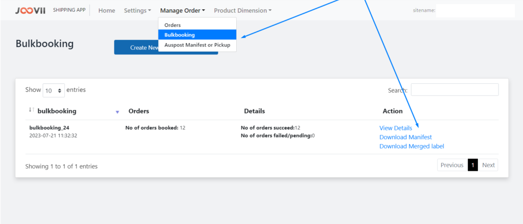 To book via Bulk Booking go to the app -> top menu -> Manage Orders-> Bulk booking . In that page you can see a list of previously created Bulk booking batches and a button to “Create New Bulk booking“.