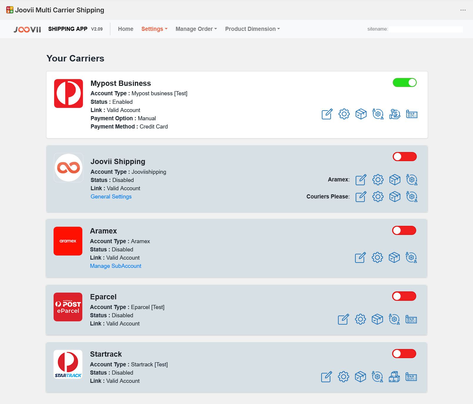 From the settings page you can add/edit account details, update other settings, add/edit package details & Manage Sendle Products/Services. Also add/edit auspost account details, update other settings like Domestic Settings & International Settings, add/edit package details, Set Payment method & payment option & Generate label samples inside your MyPost Business portal.